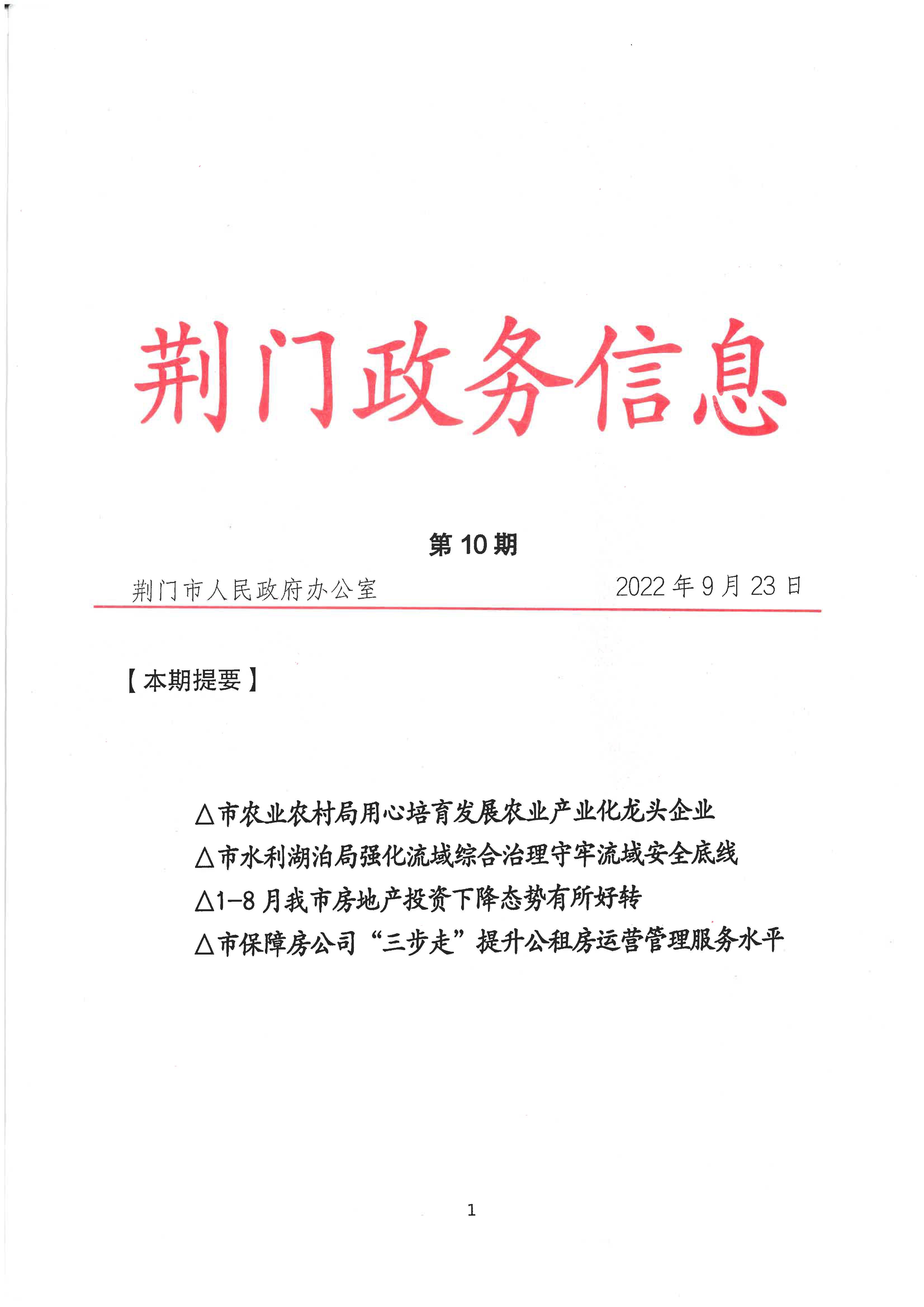 为充分发挥信息宣传的“风向标”、“信号灯”、“展示窗”作用,积极引导舆论、展示作为、树立形象,市保障房公司多措并举,加强信息宣传工作,《我市获全省首笔保租房项目融资贷款3718万元》《市保障房公司“三步走”提升公租房运营管理服务水平》两篇稿件连续两周相继被《荆门政务信息》采用。